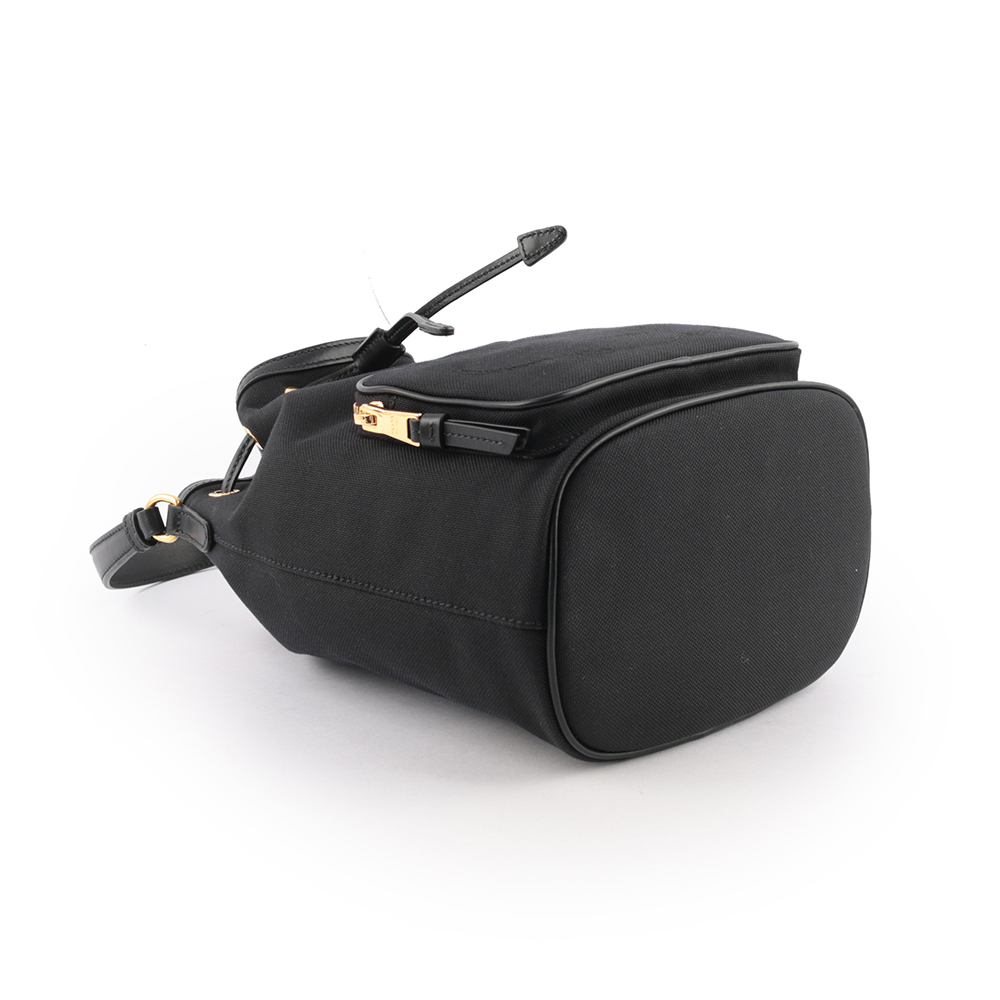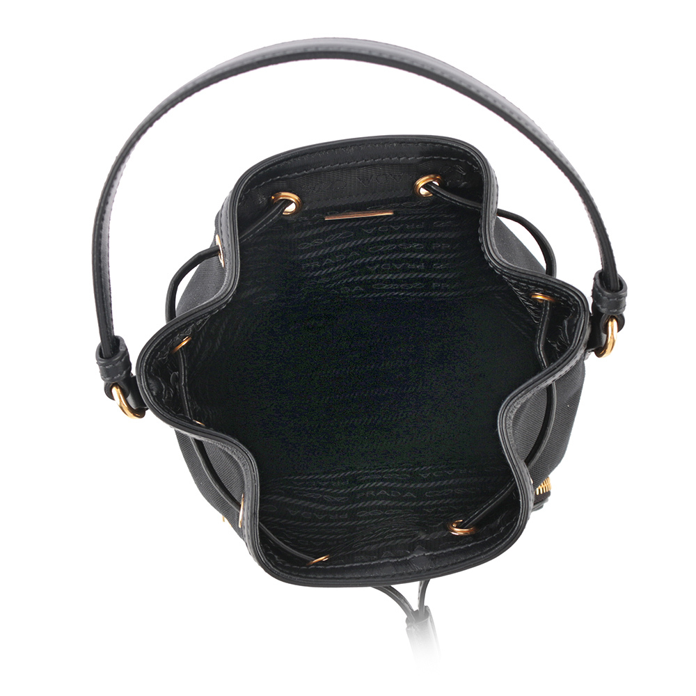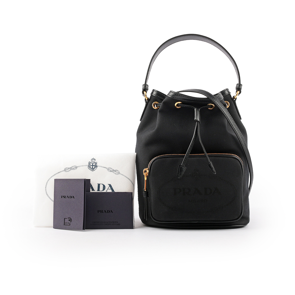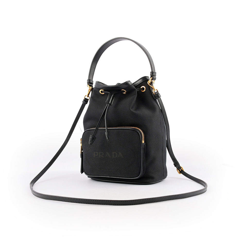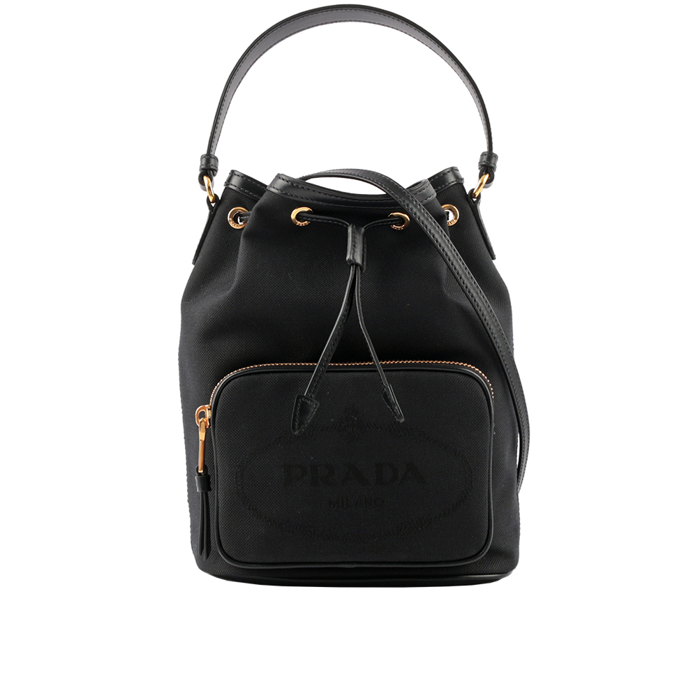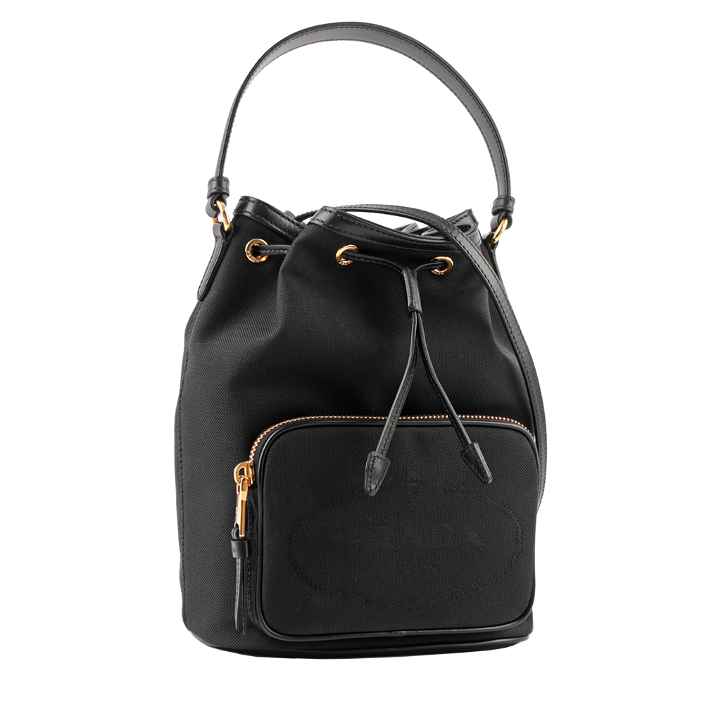 【Prada】刺繡Logo帆布拼皮革飾邊二用水桶包