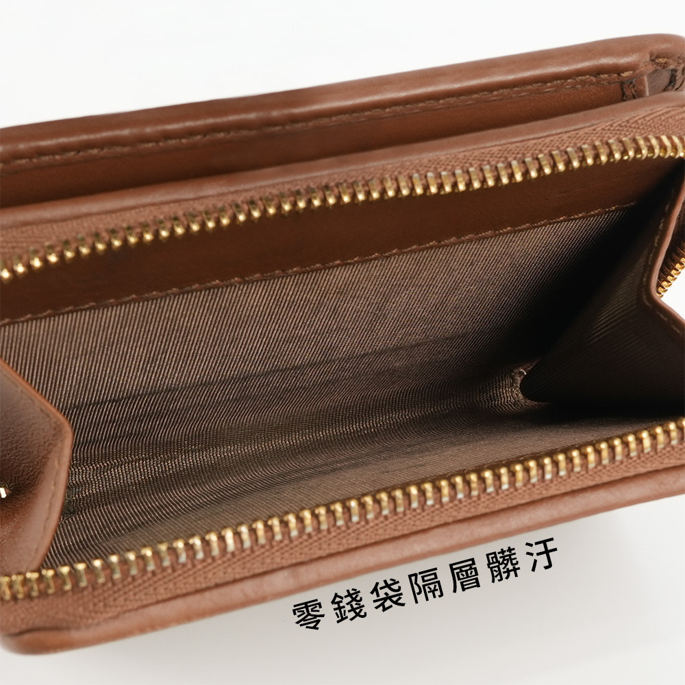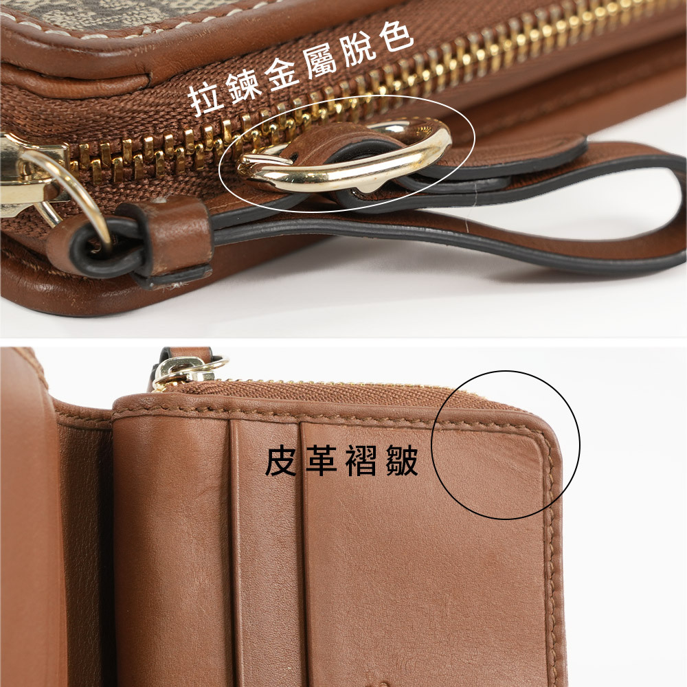 狀況:二手商品;8.5成新/皮革褶皺、拉鍊金屬脫色、零錢袋隔層髒汙