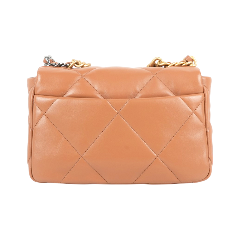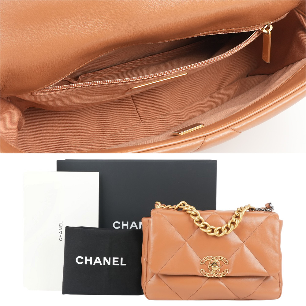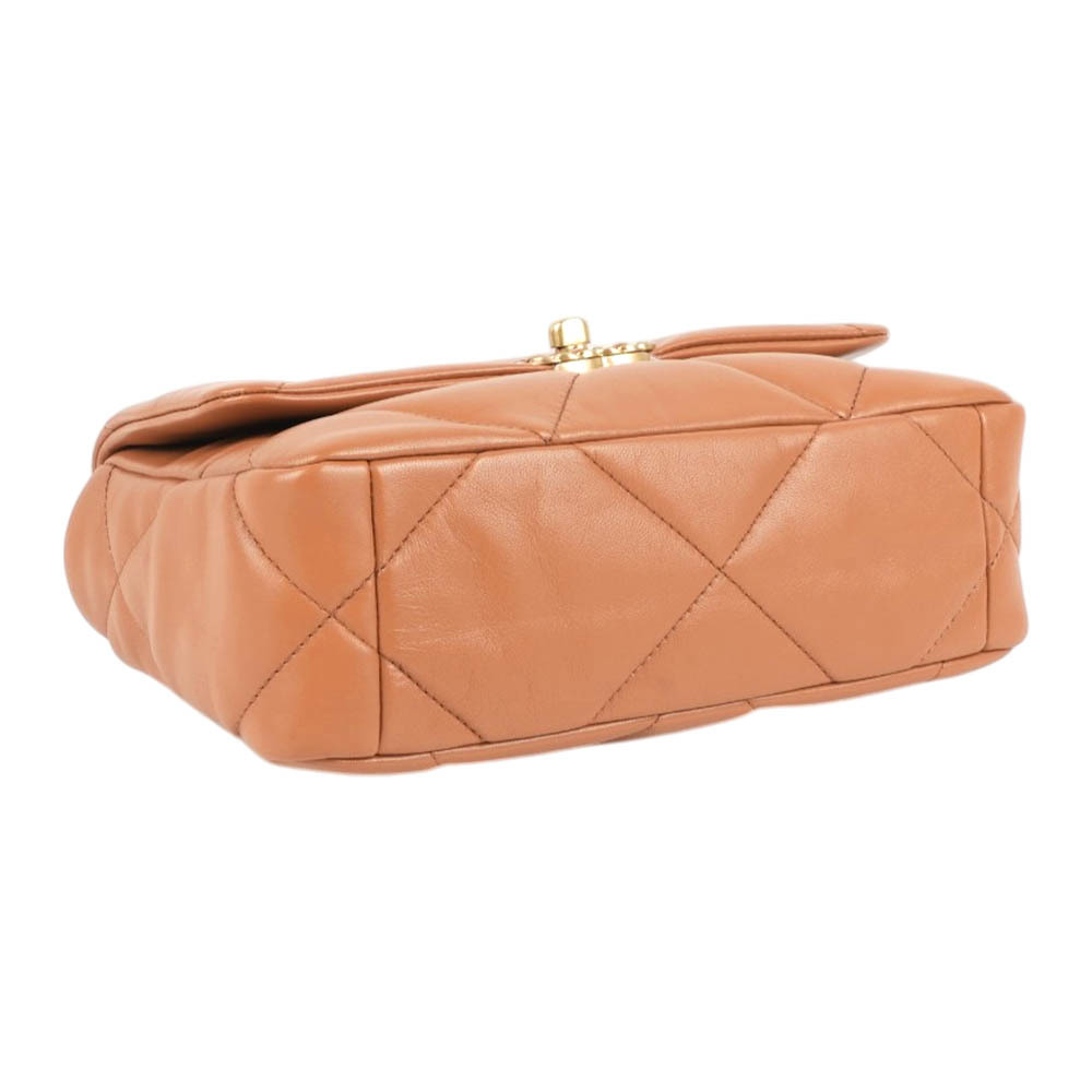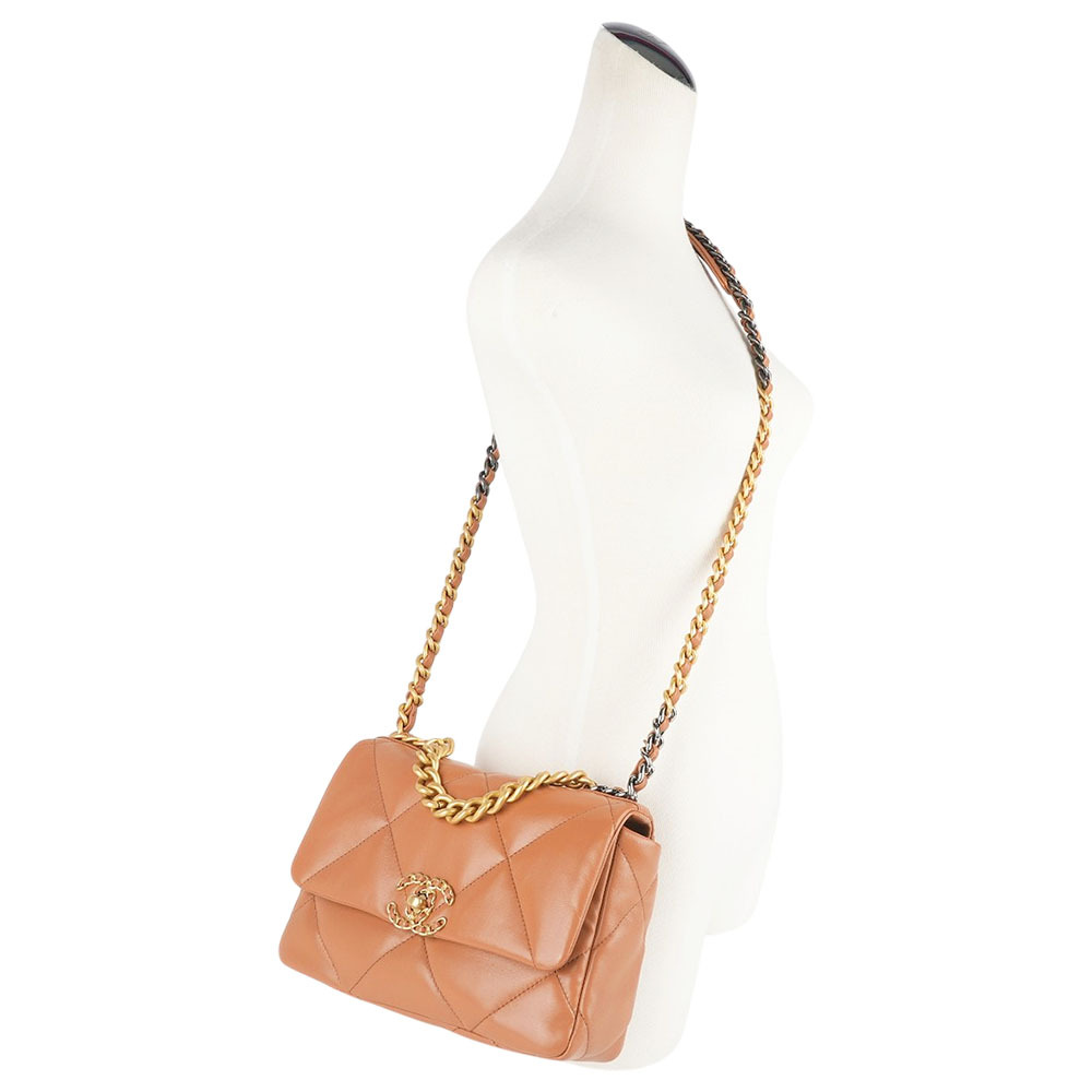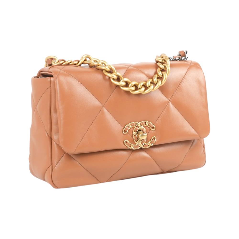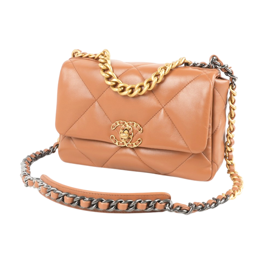 【CHANEL】Chanel 19金色CC Logo三色鍊帶菱格紋口蓋包(焦糖色)