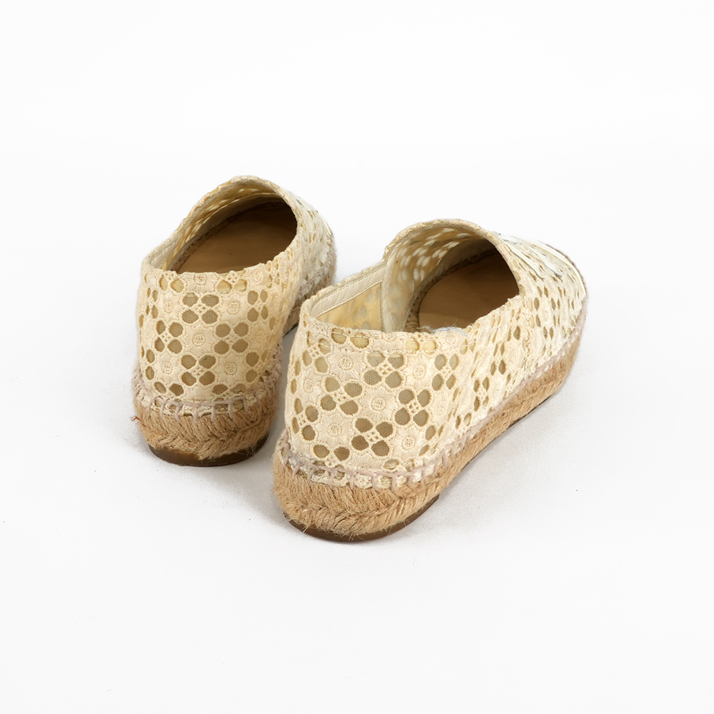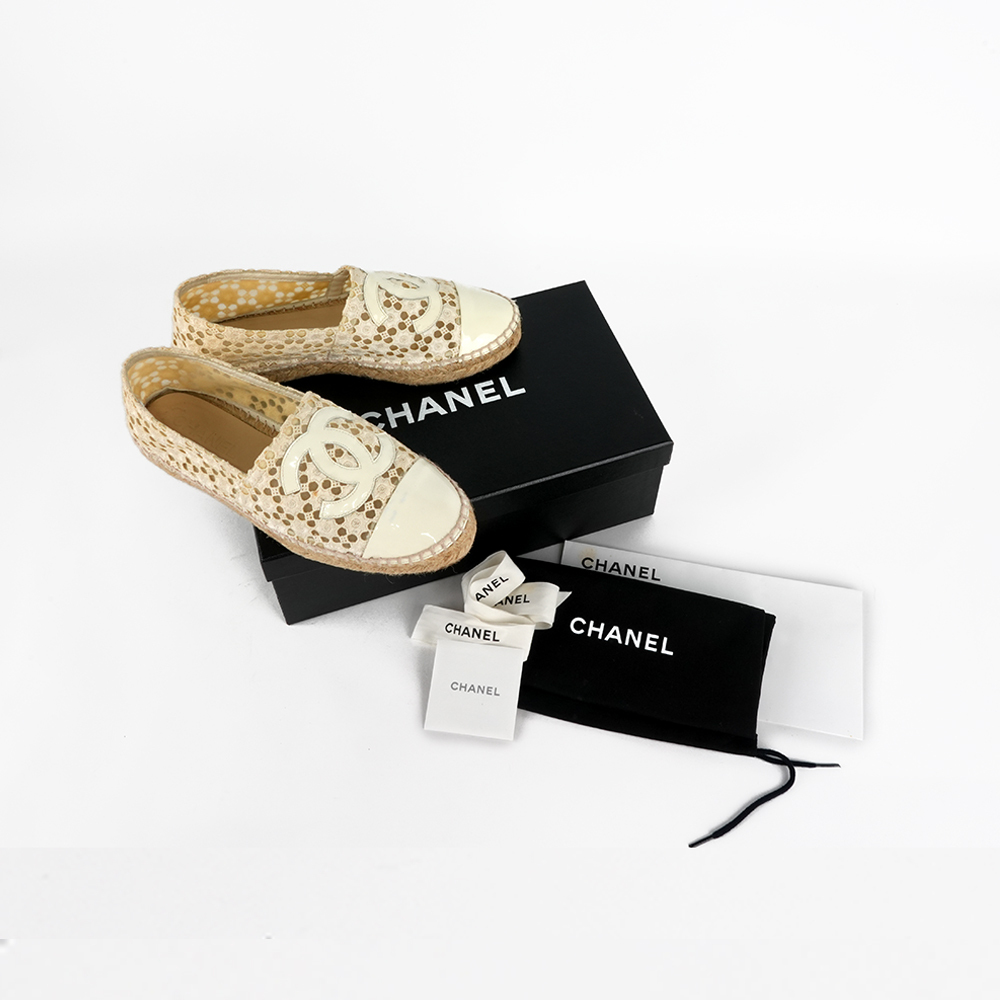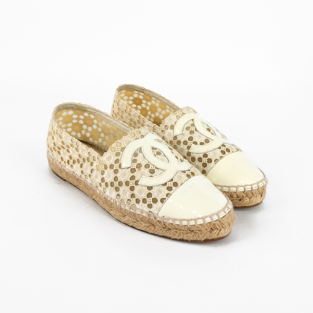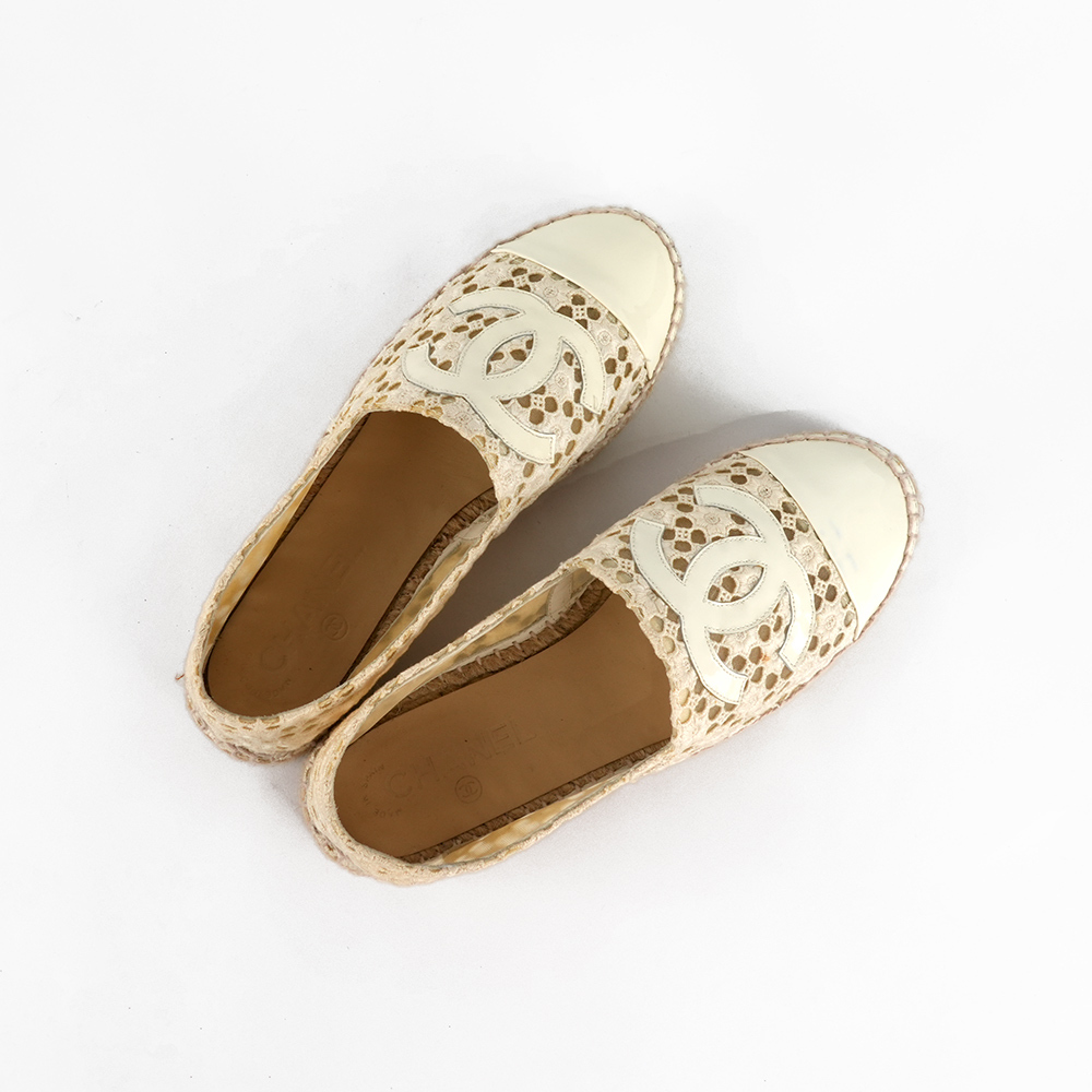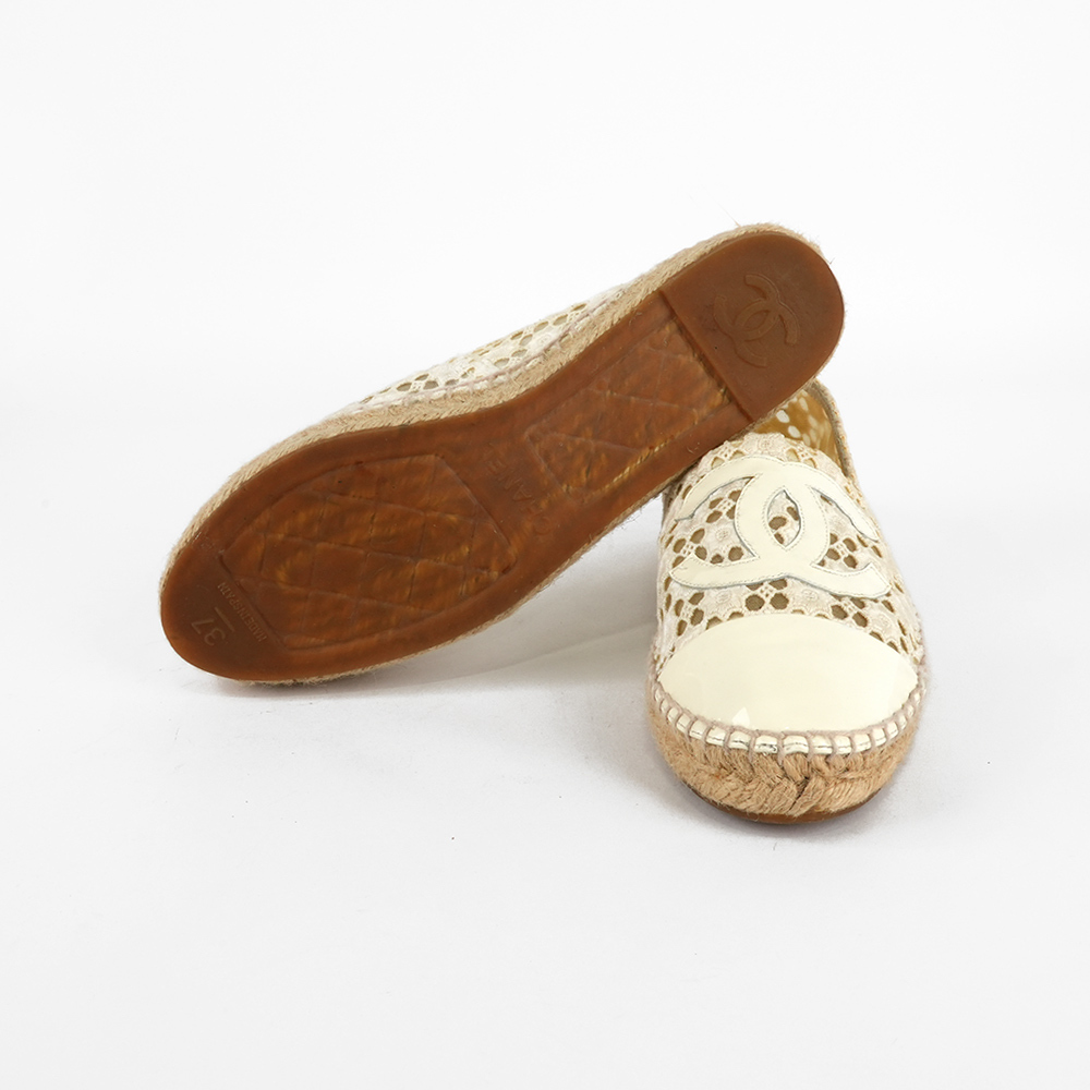 【CHANEL】CC Logo 漆皮及蕾絲草編鉛筆鞋/漁夫鞋(白色)