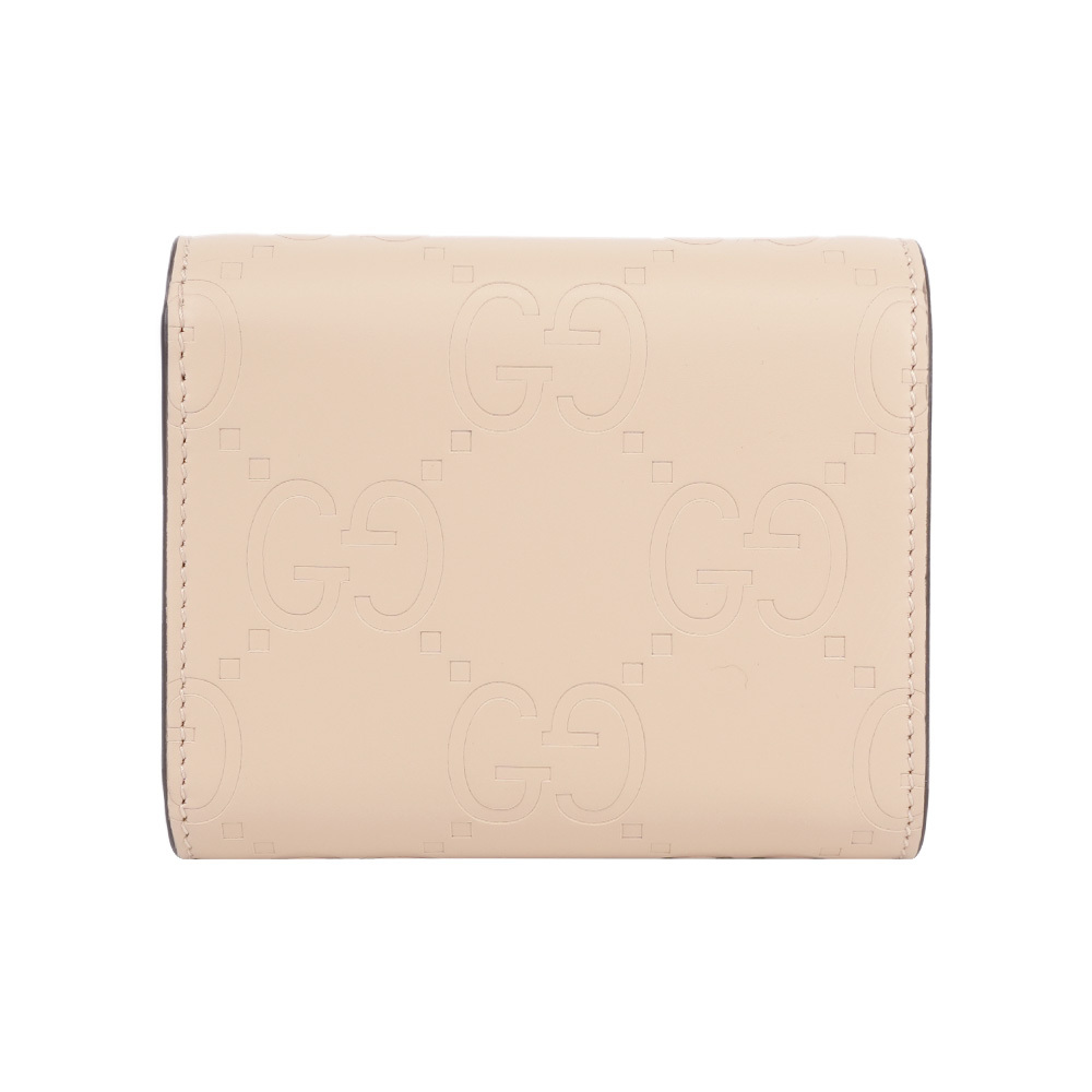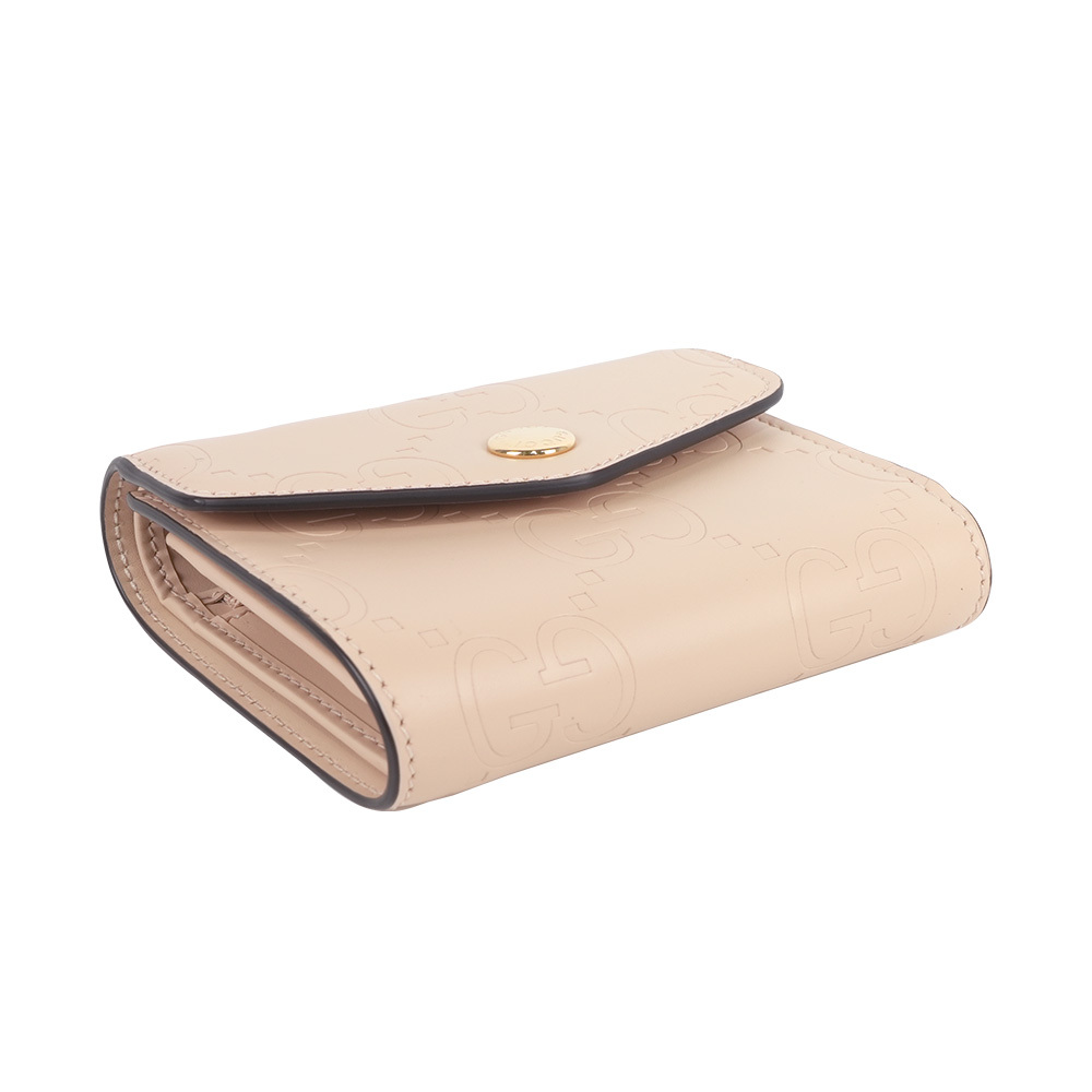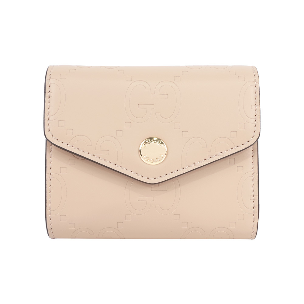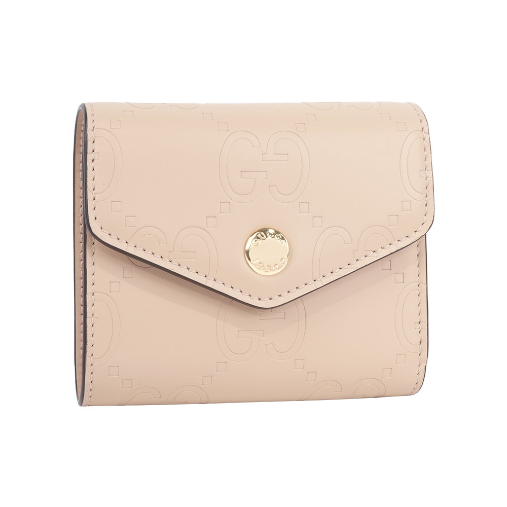 【GUCCI】GG Logo 牛皮壓紋釦式三折短夾(淺米色)